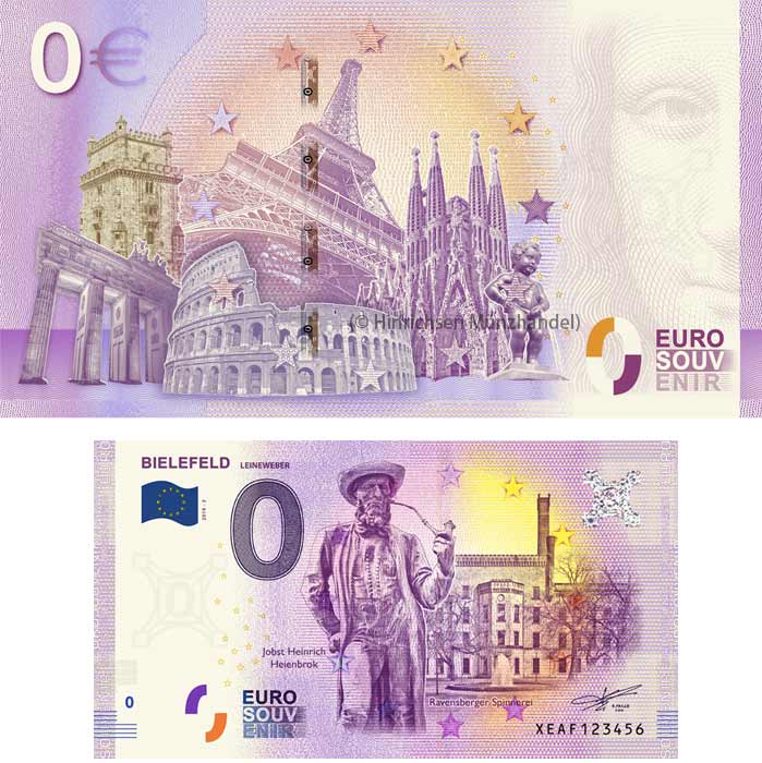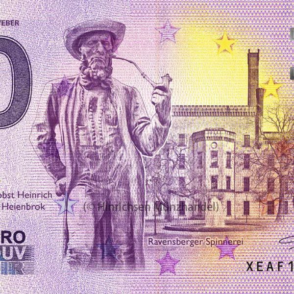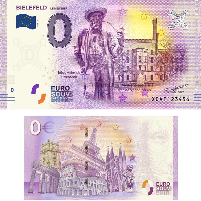 Der dritte 0-Euro-Schein der westfälischen Stadt Bielefeld zeigt ein Wahrzeichen der Stadt, den Leineweber Jobst Heinrich Heienbrok, als Bronzestatue. Im Hintergrund ist die ehemalige Ravensberger Spinnerei zu sehen, die 1855-1857 errichtet wurde und heute unter anderem das Ordnungsamt und zwei Museen beherbergt. Spezielle Seriennummern und ein kleines Kontingent haben wir für Sammler und Interessierte verfügbar.