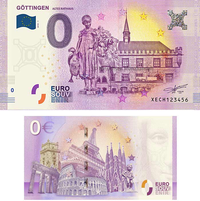 Der erste 0-Euro-Schein der Universitätsstadt Göttingen zeigt das Wahrzeichen der Stadt, das Gänseliesel als Bestandteil eines Brunnens. Im Hintergrund ist das historische Rathaus, das heute für Repräsentationszwecke und als Standesamt genutzt wird. Spezielle Seriennummern und ein kleines Kontingent haben wir für Sammler und Interessierte verfügbar.