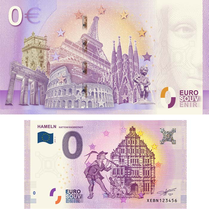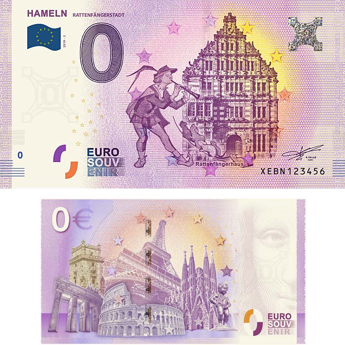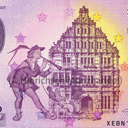 Der zweite 0-Euro-Schein der Rattenfängerstadt Hameln zeigt das Rattenfängerhaus, errichtet 1602/1603. Im Vordergrund ist der Rattenfänger als stilisierte Zeichnung der Künstlerin Anna Hammer. Spezielle Seriennummern und ein kleines Kontingent haben wir für Sammler und Interessierte verfügbar.