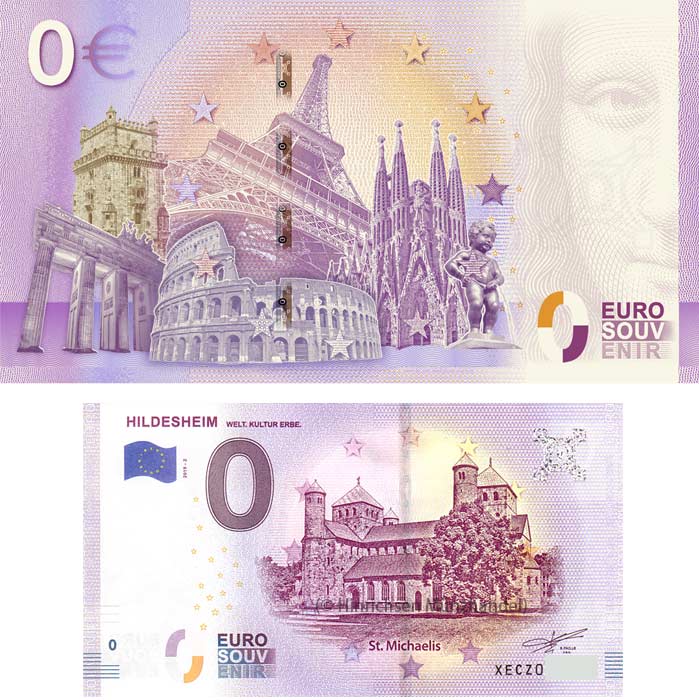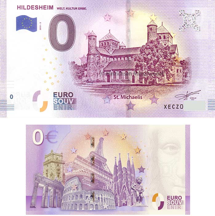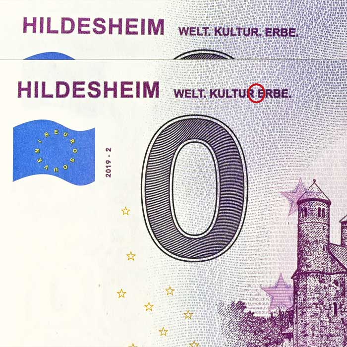Der zweite 0-Euro-Schein von Hildesheim wurde mit einem Fehler gedruckt. Bei der Druckerei wurde der Punkt nach dem Wort KULTUR nach der Druckfreigabe entfernt, was den Slogan unerlaubt veränderte. Daher wurde die gesamte Auflage neu gedruckt, 100 Scheine mit dem Fehldruck sind jedoch in den Umlauf geraten. Sie erhalten bei Bestellung zwei 0-Euro-Scheine “Hildesheim St. Michaelis”, einmal mit dem Fehldruck “WELT. KULTUR ERBE.” und einen zweiten mit dem Nachdruck “WELT. KULTUR. ERBE.”, beide Scheine mit gleicher Seriennummer. Den Fehldruck erhalten Sie zusammen mit dem exklusiven Geschenkblatt.