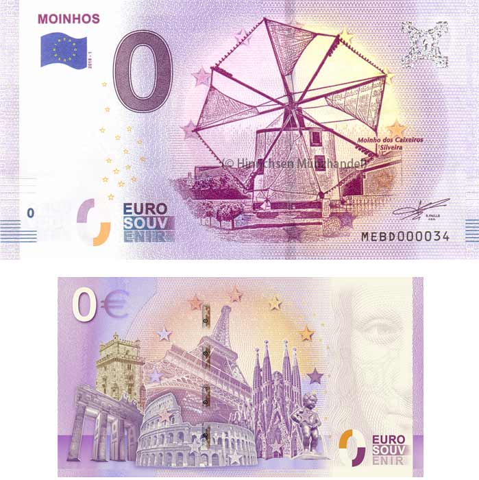 Der erste 0-Euro-Schein von Moinho dos Calxeiros Silveria, Portugal. Spezielle Seriennummern und ein kleines Kontingent haben wir für Sammler und Interessierte verfügbar.