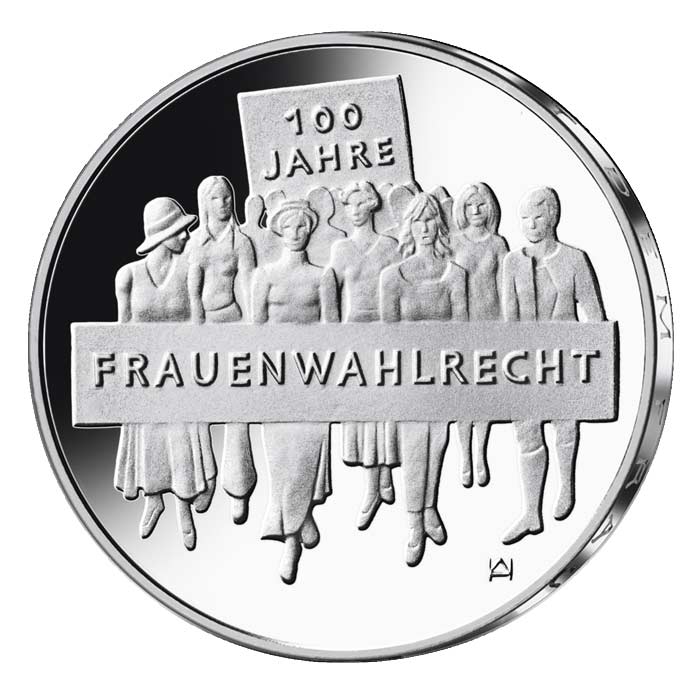 Die Bildseite der 20 Euro Sammlermünze “100 Jahre Frauenwahlrecht” zeigt eine Gruppe von Frauen, die wie in einem Demonstrationszug auf den Betrachter zuläuft. Die Durchsetzung des Wahlrechtes war vielen engagierten Persönlichkeiten zu verdanken. Daher zeigt die Münze auch keinen Demonstrationszug in einer konkreten historischen Situation, sondern eine Gruppe von Frauen aus verschiedenen Zeiten, die bis heute für eine gleichberechtigte Teilhabe an politischen Prozessen kämpft. Die Münze gedenkt damit sowohl der demokratischen Errungenschaft des Frauenwahlrechtes 1919 als auch der Dynamik, die bereits 1908 mit der Aufhebung der Vereinsgesetze, die Frauen an politischer Betätigung hinderten, begann.