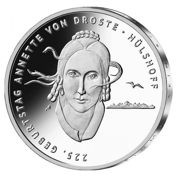 Die 20-Euro-Sammlermünze anlässlich des 225. Geburtstages von Annette von Droste-Hülshoff (1797–1848) eine 20-Euro-Sammlermünze prägen zu lassen. Die Münze würdigt die bekannte deutsche Schriftstellerin und Komponistin, die zu den bedeutendsten deutschsprachigen Dichtern des 19. Jahrhunderts zählt.