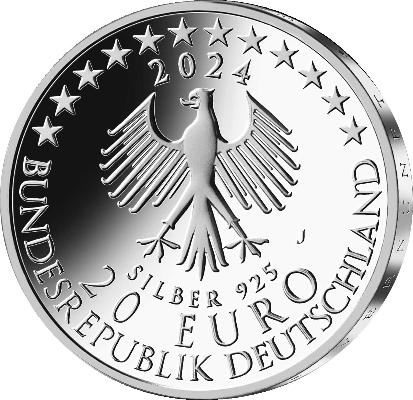 Die Wertseite zeigt einen Adler, den Schriftzug „BUNDESREPUBLIK DEUTSCHLAND“, Wertziffer und Wertbezeichnung, das Prägezeichen „J“ der Hamburgischen Münze, die Jahreszahl 2024 sowie die zwölf Europasterne. Zusätzlich ist die Angabe „SILBER 925“ aufgeprägt.