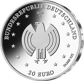 Die Wertseite zeigt einen Adler, den Schriftzug „BUNDESREPUBLIK DEUTSCHLAND“, Wertziffer und Wertbezeichnung, das Prägezeichen „G“ der Staatlichen Münzen Baden-Württemberg, Prägestätte Karlsruhe, die Jahreszahl 2024 sowie die zwölf Europasterne. Zusätzlich ist die Angabe „SILBER 925“ aufgeprägt.