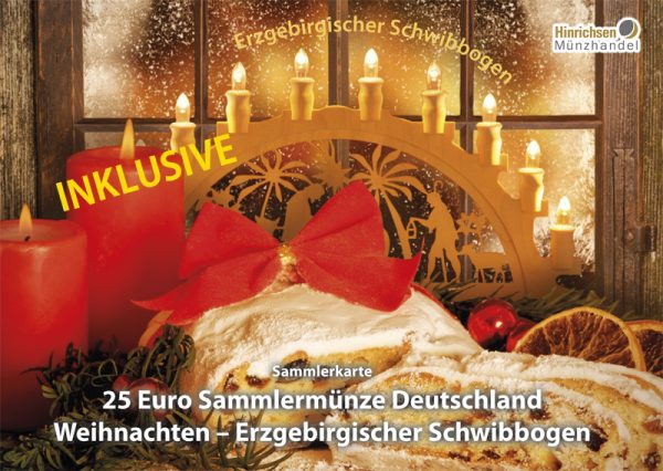 Im Jahr 2023 wird die dritte Münze aus der Serie “Weihnachten” herausgegeben: Die 25 Euro Sammlermünze “Erzgebirgischer Schwibbogen“. Der erzgebirgische Schwibbogen ist ein mit Kerzen bestücktes, weihnachtliches Objekt, das erstmals im 18. Jahrhundert gefertigt und zunächst im bergmännischen Kontext verwendet wurde. Er wird heute als fester Bestandteil der traditionellen erzgebirgischen Weihnacht gesehen, hat inzwischen aber auch weit über das Erzgebirge hinaus – sogar internationale – Bekanntheit erlangt.